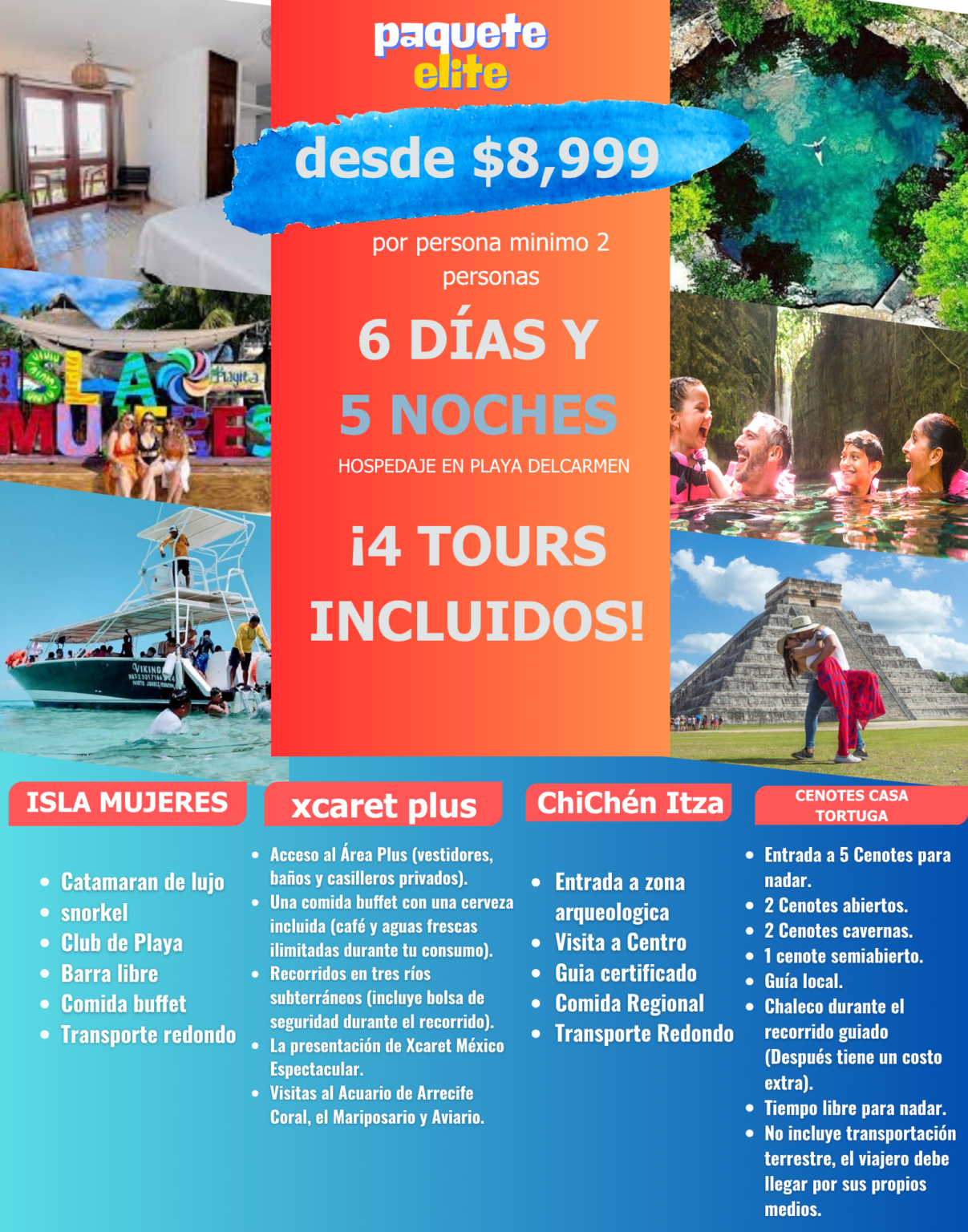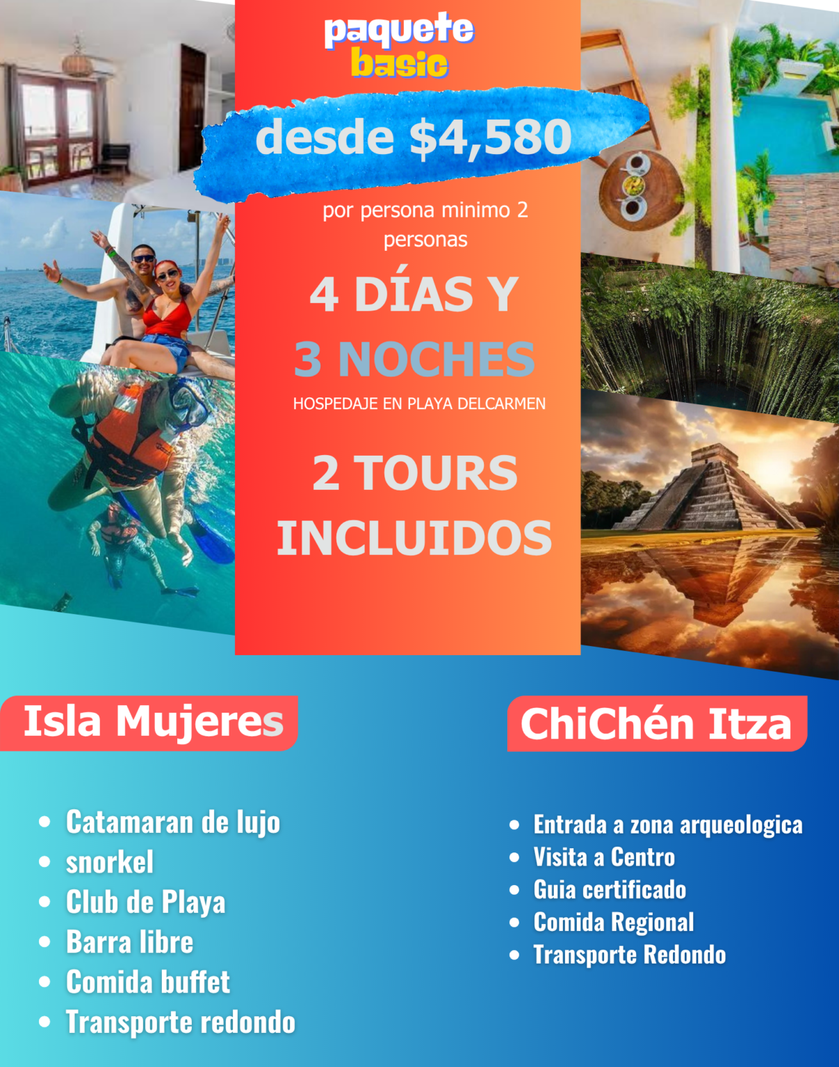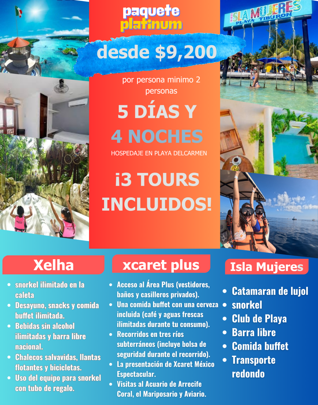 Vive una experiencia única en el Caribe Mexicano: paseo en catamarán con música y diversión, snorkel en arrecifes de coral, barra libre, buffet y tiempo libre para disfrutar del centro de Isla Mujeres. ¡Un día de sol, mar y fiesta que no olvidarás!